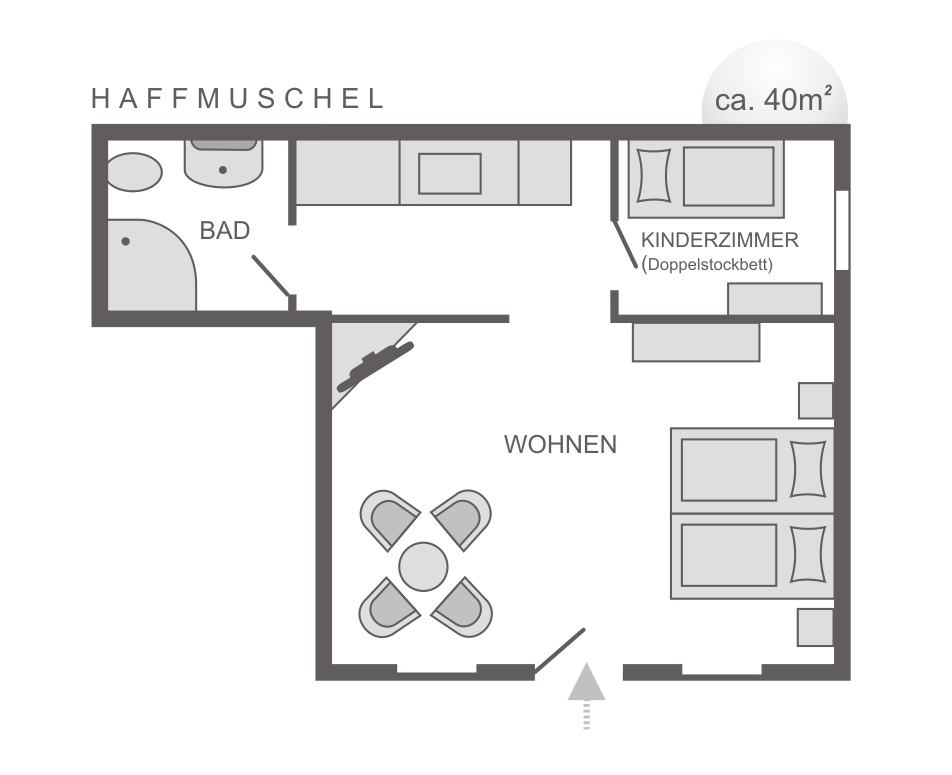 2 Personen, Wohn- Schlafbereich mit Doppelbett, separater Schlafraum mit Doppelstockbett und integrierter Küche, TV, WC/Dusche, Küchenzeile, 2- Plattenkocher, Kühlschrank, Kaffeemaschine, Wasserkocher, Geschirr für 6 Personen.