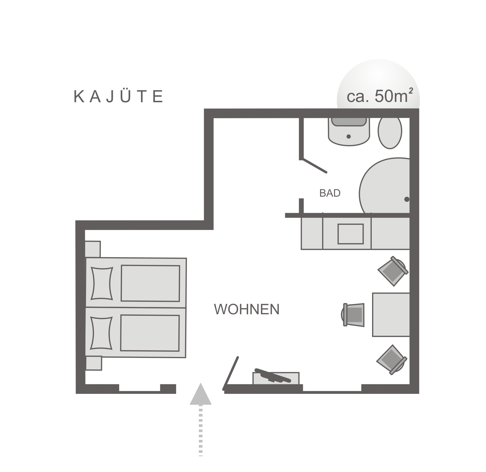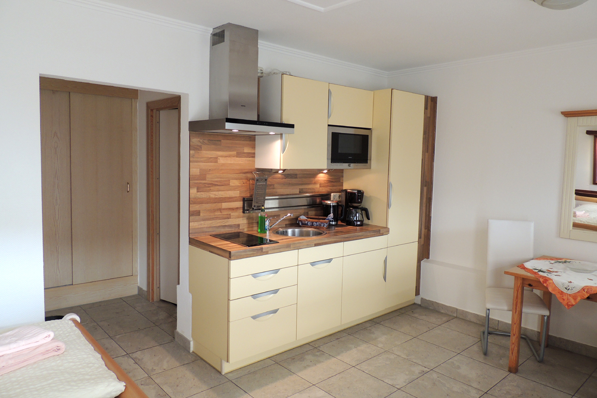 Schlafbereich, TV, WC/Dusche, Küchenzeile, Plattenkocher, Kühlschrank,