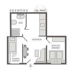 separates Schlafzimmer mit Doppelbett sowie Kinderzimmer mit
