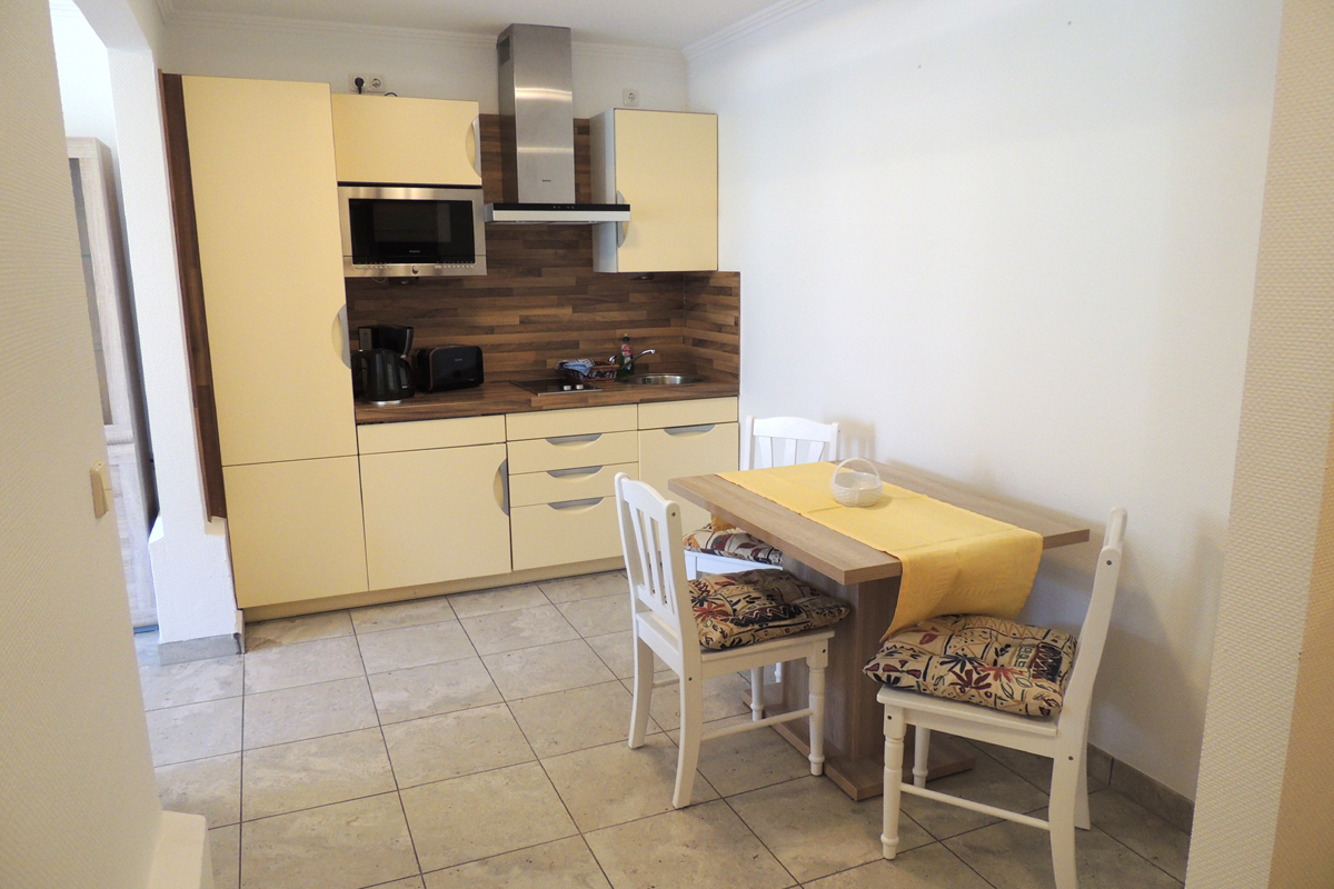 Kühlschrank, Kaffeemaschine, Wasserkocher, Geschirr für 3