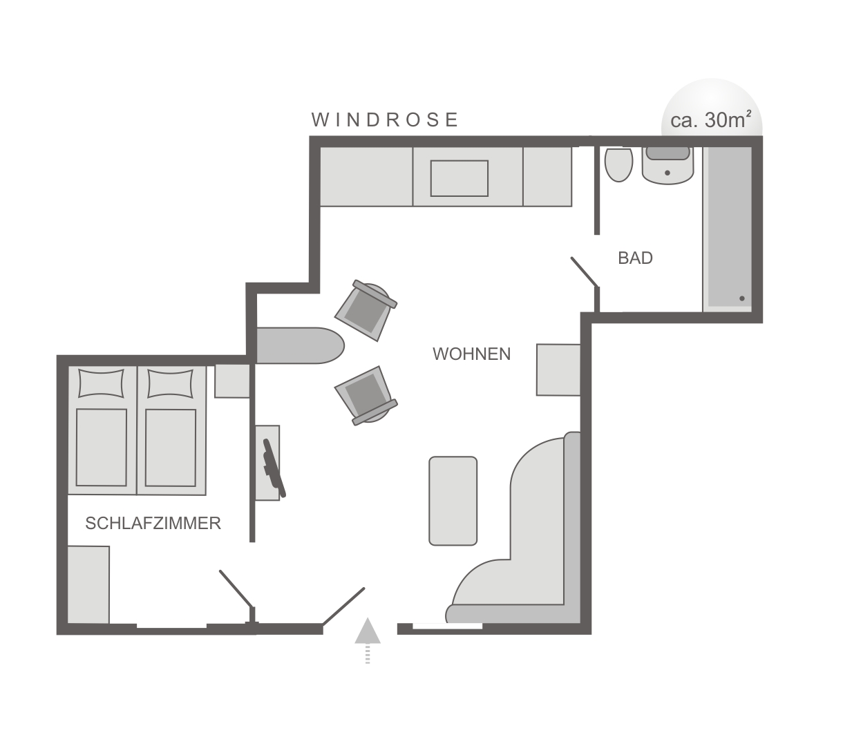 Couch, integrierte Küche, separatem Schlafzimmer mit Doppelbett,